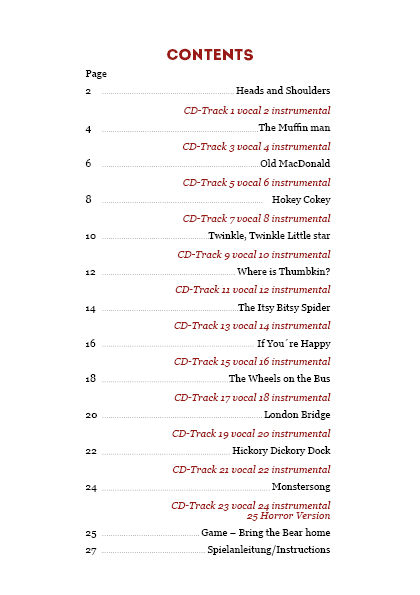 Unsere Lernstudio-CD präsentiert 11 typische englische Kinderlieder und einen eigenen Song. Die liebevoll gezeichneten Illustrationen helfen wichtige Schlüsselvokabeln der Songtexte visuell und verbal zu trainieren. Ein lustiges Spiel im Songheft ist ein Spaß für die ganze Familie beim Erlernen und Wiederholen von Wörtern zu Grundthemen, wie z.B. Farben, Zahlen, Tiere.